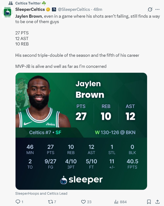 布朗此役鏖战46分钟,27中9,三分10中4,罚球10中5,拿到27分12助攻10篮板1抢断,命中率33.3%,三分命中率40%,罚球命中率50%,真实命中率43%,正负值+11。